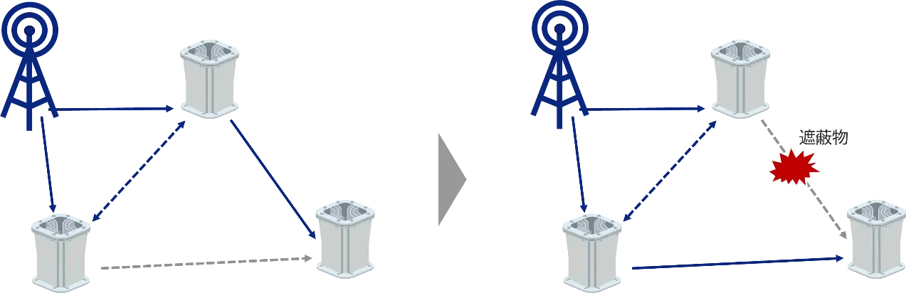 本中継器は、複数の方向から受信するミリ波電波のうち、最も無線品質の良い中継ルートを選択し、メッシュ状のエリアを形成します。ミリ波基地局または隣接の中継器から受信する信号の劣化を検知した場合、最適な中継ルートを計算し、瞬時に切り替えを行います。建物建設や樹木などの環境変化により中継ルートが遮蔽された場合も、常に最適な中継ルートを自律的に選択し、最適化を行います。