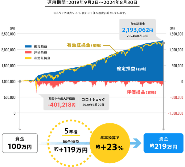 特設ページには、『トラリピ戦略リスト』で提案している「NOK/SEK Half&Half戦略」を2019年9月~2024年8月の5年間で運用した場合のバックテスト結果を掲載しております。