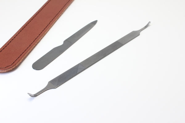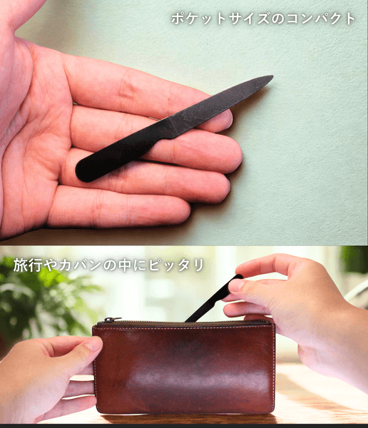 旅行や携帯用にも便利なポケットヤスリや、栃木レザーを使用した専用ケースもセットで用意。
