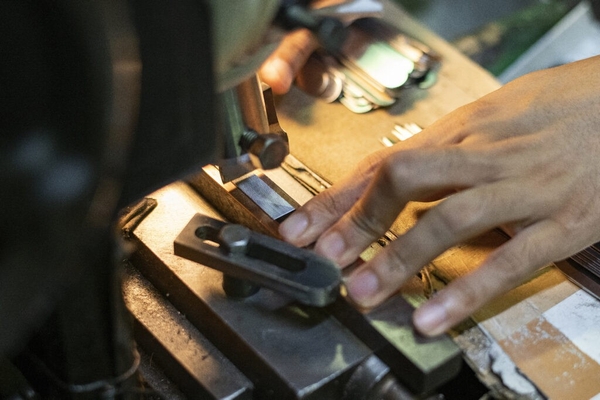 吉田ヤスリの“目立て”は、専用の鏨(たがね)を用いて斜めに溝を刻む技術。