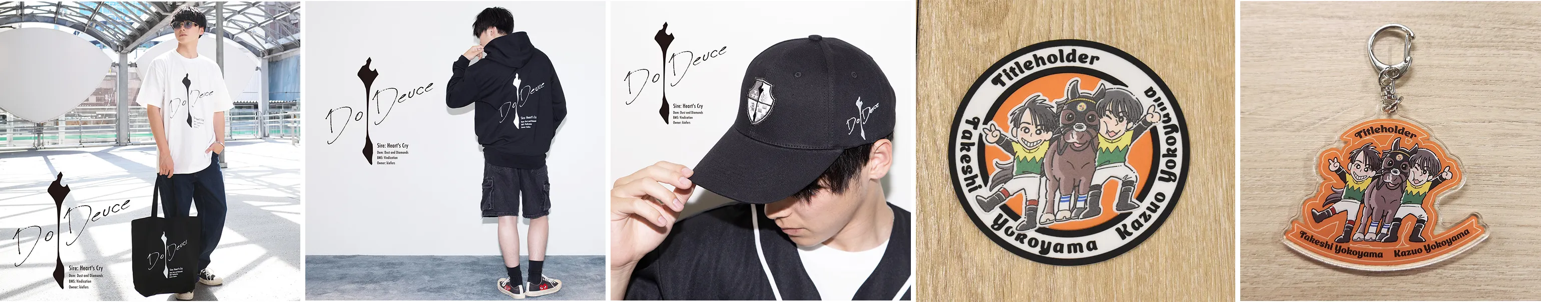 ターフィーショップではドウデュース号のオリジナルTシャツ、パーカー、キャップに加え、昨年の引退式が記憶に新しいタイトルホルダー号のかわいらしいイラストがデザインされたラバーコースターとアクリルキーホルダーを販売いたします。