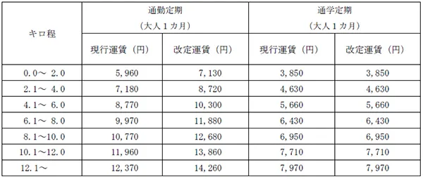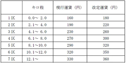 普通旅客運賃のうち、初乗り運賃(キロ程2.0km以下)は20円、その他の区間(キロ程2.1km以上)の運賃については30円ずつ、それぞれ引き上げます。
