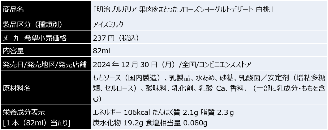 株式会社 明治(代表取締役社長:松田 克也)は、2024年12月30日(月)より「明治ブルガリア 果肉をまとったフローズンヨーグルトデザート 白桃」を全国のコンビニエンスストアにて発売します。