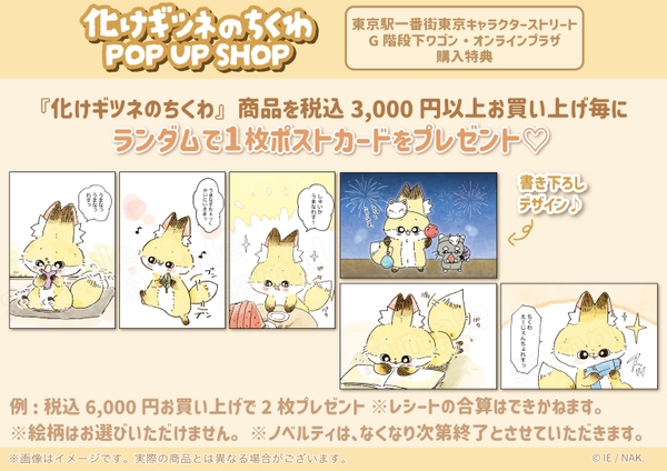 いよいよ夏も本番!「化けギツネのちくわ POP UP SHOP」の開催にあたって、原作者の井々エビ出汁さんが、夏祭りを楽しむちくわとたびの新たなイラストを描き下ろしました。同店では、フェイスポーチやメジャーなどの新商品からぬいぐるみなどの人気アイテムまで、『化けギツネのちくわ』の商品を多数販売するほか、ノベルティとして同店限定のポストカードをご用意しております。ちくわとたびと一緒に夏を満喫しましょう!
