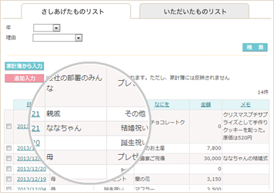 誰にいつ何を贈ったのか、もしくは頂いたのかなど、大切なおつきあいの履歴がわかるリストです。