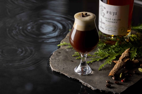 雨音BARでは、アイリッシュコーヒースタイルの「雨の日オリジナルホットカクテル」を提供します。カクテルに使用するのは、柔らかい口当たりと豊かな樽熟香が特徴の「シングルグレーンウイスキー富士」と、バレルエイジドコーヒーの造詣が深い「猿田彦珈琲」協力のもと熟成させたこだわりのコーヒーです。コーヒーは、「シングルグレーンウイスキー富士」のウイスキー樽でコーヒー豆を熟成させ、カクテルにしてウイスキーと合わせることで、華やかな香りをより楽しむことができます。仕上げにのせたクリームとコーヒーの濃厚な味わいから始まり、香ばしさと芳醇な香りが複雑に重なり、最後の一口までさまざまな香りと味の変化を楽しめます。梅雨の時期の河口湖は肌寒く、森にしとしと降る雨で冷えた身体を優しく温め、ホッとする一杯を堪能します。