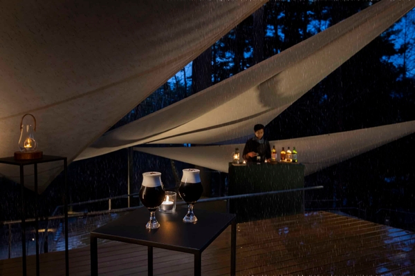 各施設が独創的なテーマで、圧倒的非日常を提供する「星のや」。日本初のグランピングリゾート「星のや富士」では、2023年6月10日から7月20日の間、雨の日限定で、雨音を楽しむ森の特別席でオリジナルカクテルを味わう「雨音BAR」を開催します。星のや富士の「クラウドテラス」に、雨音が心地良く響き合う特別席を用意し、ウイスキー樽で熟成させたバレルエイジドコーヒーとジャパニーズウイスキーを合わせたホットカクテルを堪能します。