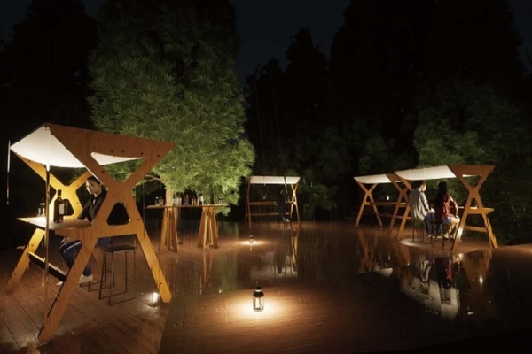 森の中に位置するクラウドテラスは、木々から雨が落ちる音や、風とともに雨が降る音、雨が枝に打ちつける音など、さまざまな雨音を楽しめる空間です。その中に、雨音が心地良く響き、音の重なりを楽しめる屋根を取り付けた特別席を、雨の日限定で用意しました。夜の森の中でリラックスしながら、雨音に耳を傾け、雨の森の旋律を感じ、お休み前のひとときを過ごします。