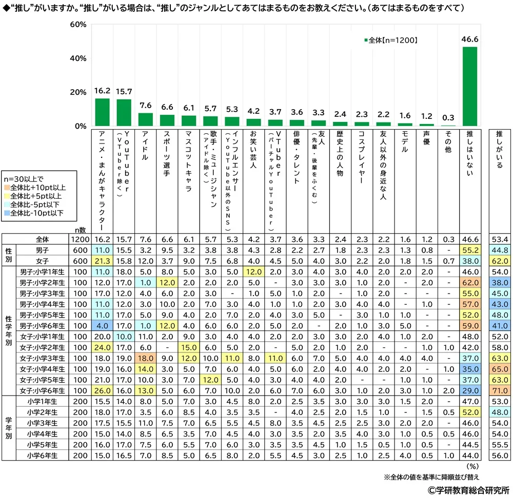 推しのジャンル 男子の1位は「YouTuber」、女子の1位は「アニメ・まんがキャラクター」