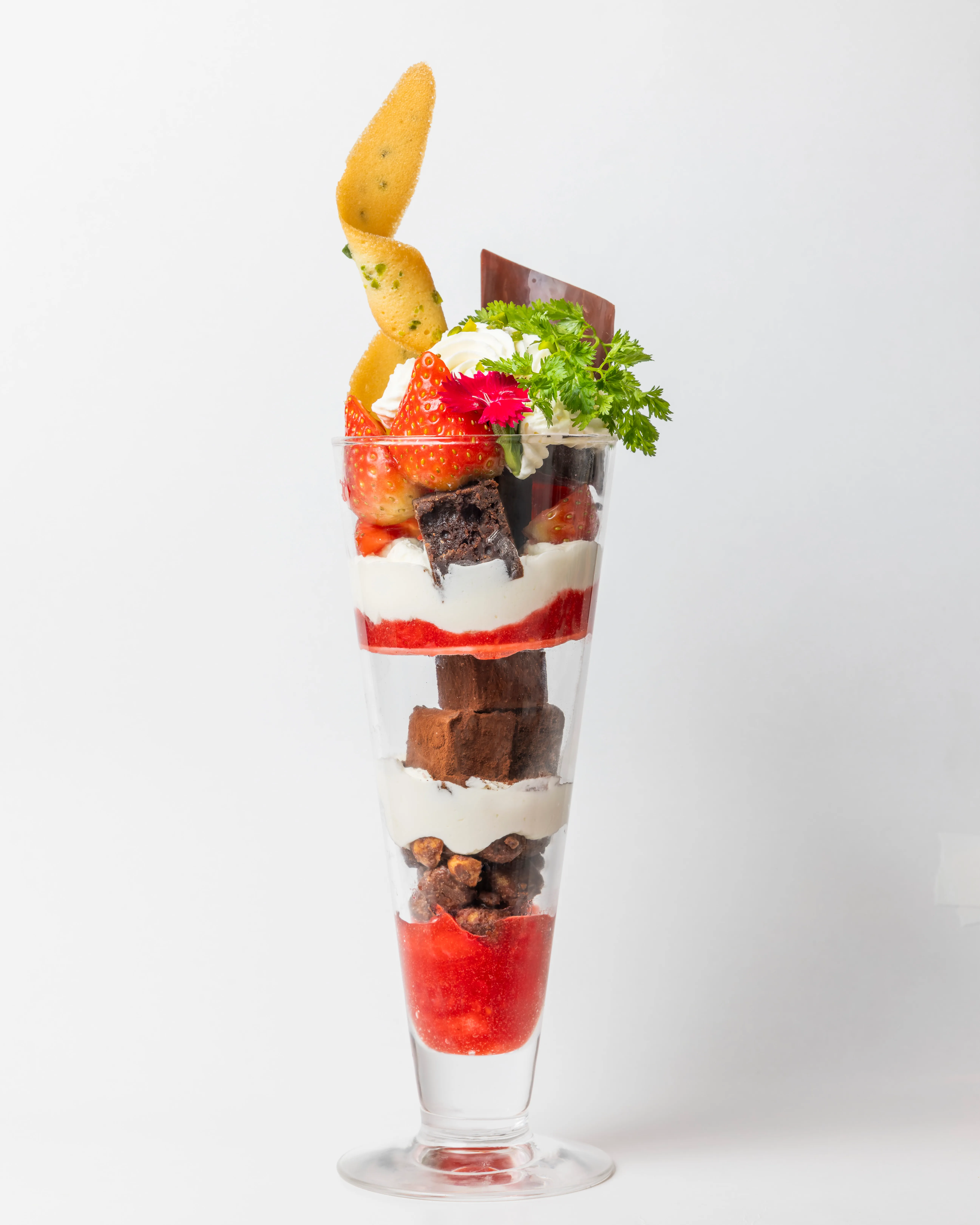 白いバラの花束をイメージしたパフェ。最後まで美味しく食感を楽しみながら食べられるように、酸味と甘味のバランスを考え、甘すぎない大人な味わいのパフェに仕上げました。