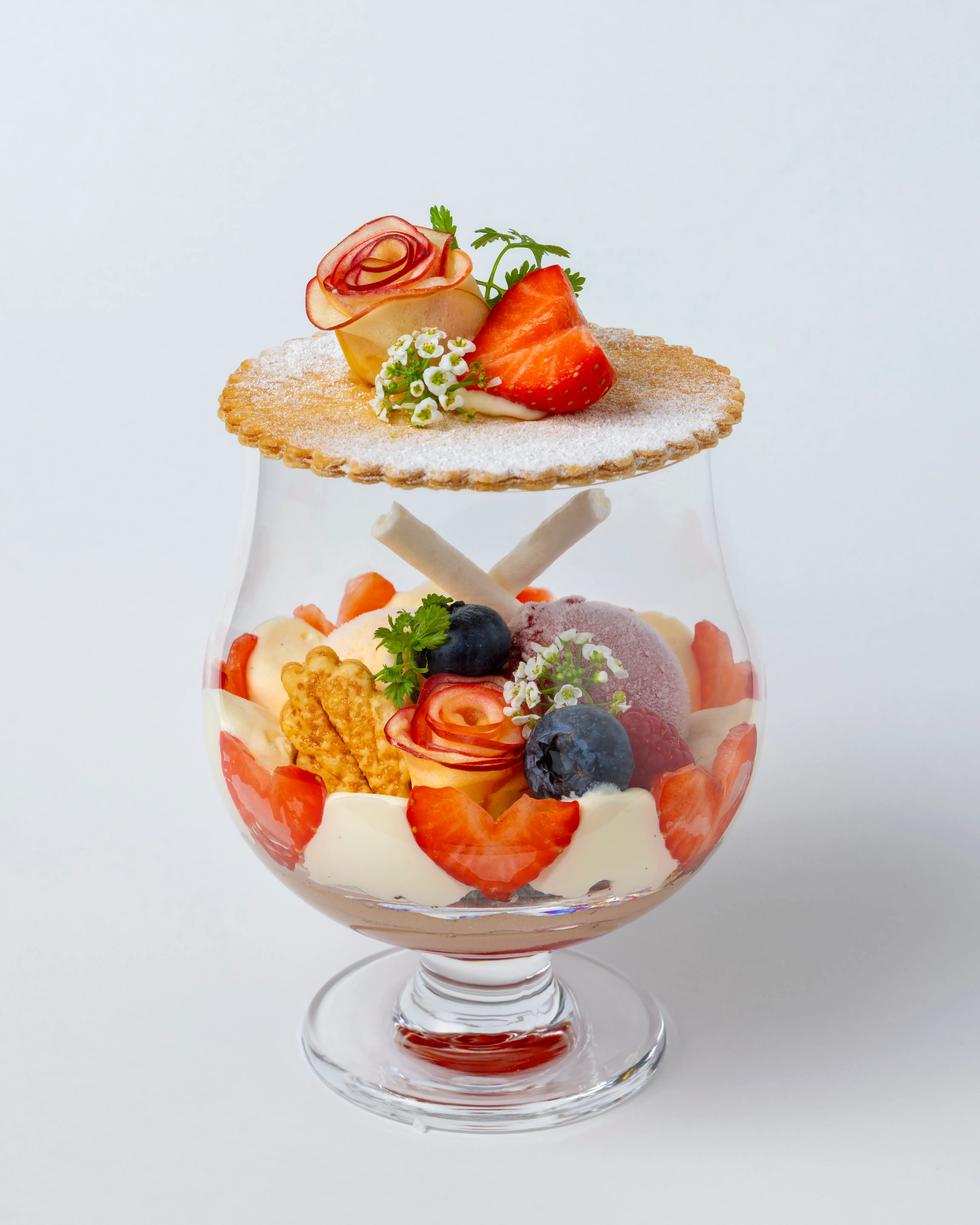 バラの形にしたりんごをトッピングするなど、華やかで可愛らしい庭園をイメージ。甘酸っぱいラズベリーアイスとクリーミーで口溶けのよいバニラアイスに、やさしい甘さを持つクリームがマッチした魅惑の一品です。