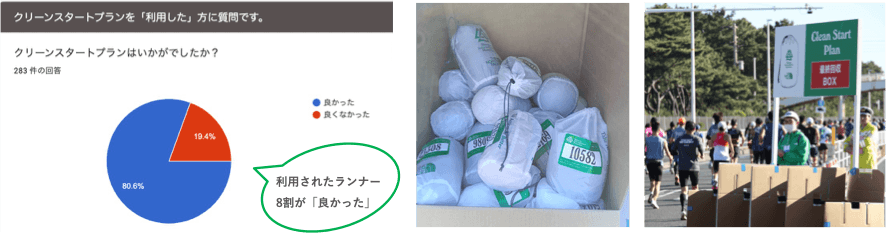 この取り組みを利用したランナーの約8割が「良かった」と回答。「今まで着用できなかった薄手のダウンで快適に待機出来た」や「脱ぎ捨てる罪悪感がなくなった。」とのコメントをいただきました。
