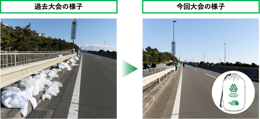 今年は新たな取り組み「クリーンスタートプラン」を実施したことも功を奏しています。参加ランナー、運営ボランティアの意識向上はもちろんのこと、会場内でもゴミゼロに向けてさまざまな取り組みを拡充しており、応援者、来場者すべての皆様の環境配慮意識向上により、ゴミを出さないマラソン大会にむけて前進を続けています。