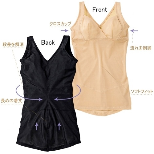 本商品は、ブラジャーを着けた上に着用するタイプで、伸び縮みするキックバック力の強いストレッチ素材を使用しています。着用時には、一時窮屈さが残るものの、時間が経つにつれて体になじみ、ここち良いソフトなフィット感へと変化するのが特長で、ボディラインのデコボコをソフトに補整する効果があります。