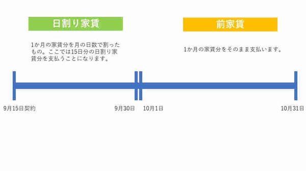 例えば、9月15日が家賃発生日(たいていの場合、賃貸借契約締結日になります)の場合、9月15日~30日までの間の家賃は「日割り家賃」が適用されますので、支払い家賃が細かくなってしまう可能性が出てきます。ただ翌月分(ここでは10月)に関しては「1か月分の家賃」が発生するので、初期費用の中に含まれている「前家賃」は、9月分(日割り家賃)と10月1か月分の家賃の合計額を支払うことになります。