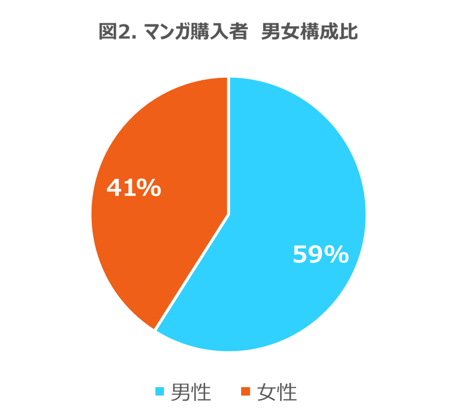 近年、英国ではグラフィックノベルの人気が高まっています。特にマンガは顕著で、グラフィックノベル購入冊数に対するマンガの比率は、2016-2017年調査の37%から2022-2023年調査では56%と半数以上を占めるに至りました(図1)。英国でのマンガ購入者の内訳をみると、男性が59%、女性が41%と男性比率が高く(図2)、年代別では25歳未満が一貫して最も多い結果となりました。また25歳未満は、2019年から2023年にかけて構成比をさらに伸ばしており、マンガ市場の拡大を牽引しました。
