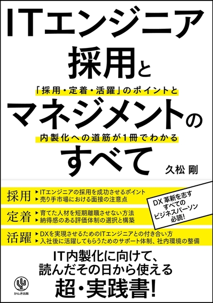 株式会社かんき出版(本社:千代田区 代表取締役社長:齊藤龍男)は、『ITエンジニア採用とマネジメントのすべて 「採用・定着・活躍」のポイントと内製化への道筋が1冊でわかる』(久松 剛/著)https://kanki-pub.co.jp/pub/book/details/9784761276218を2022年7月21日より全国の書店・オンライン書店等(一部除く)で発売いたします。