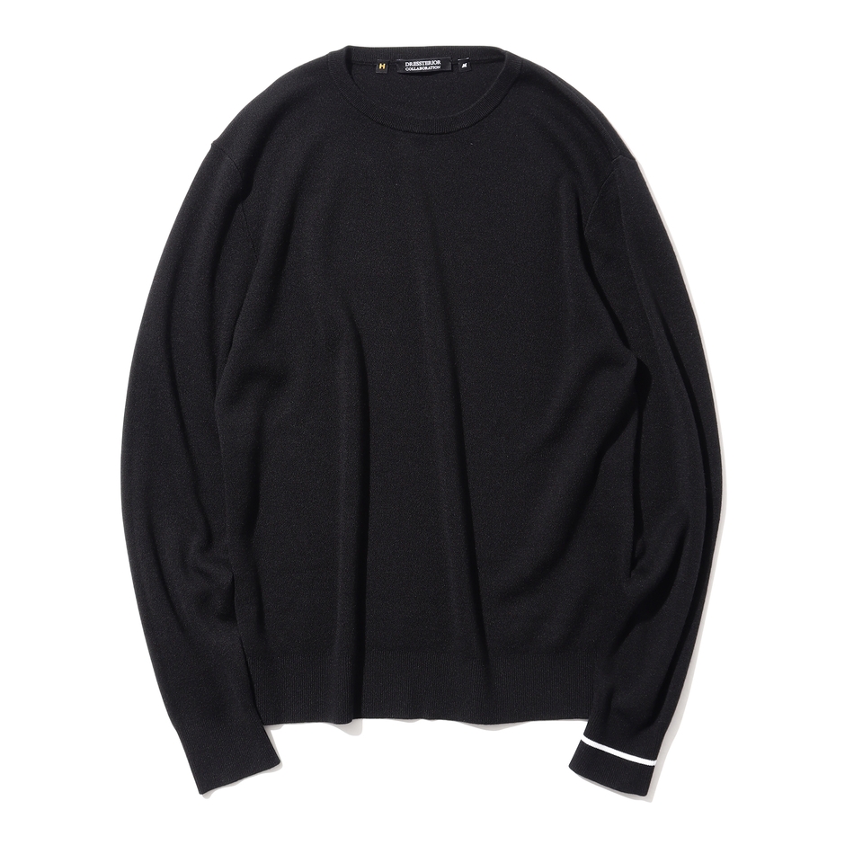 一般的なニットに多い天竺編みではなくスムース編みにすることで、なめらかな表面と適度なふくらみが加わった良質な肌触りを実現。左袖のみに施されたホワイトラインがこだわりのワンポイント。