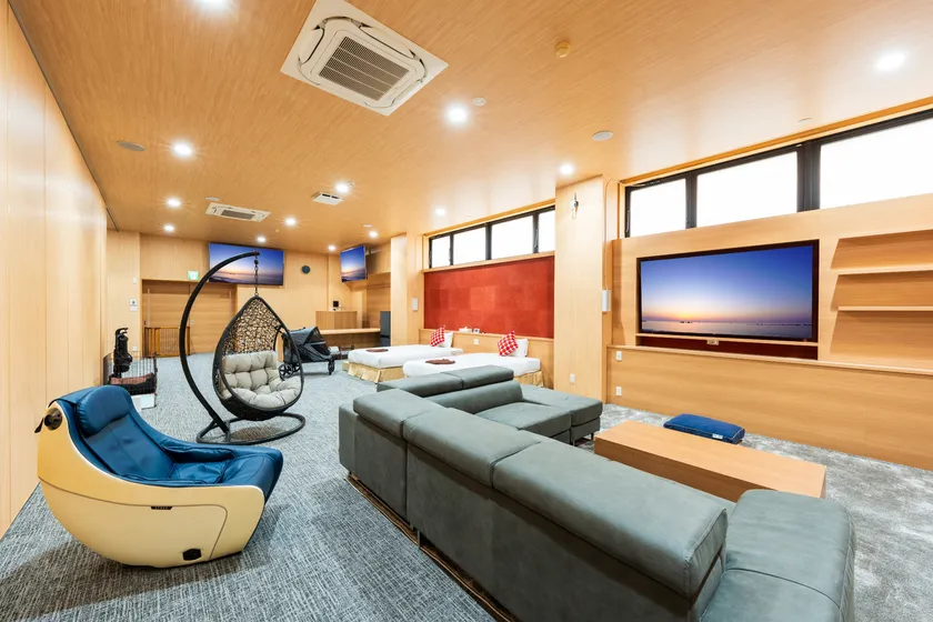 ・大型テレビ75型・金庫・エクストラベッド・マッサージチェア・ハンモック・ドライヤー・冷蔵庫・電気ケトル・空気清浄機完備・ワンちゃん用カート