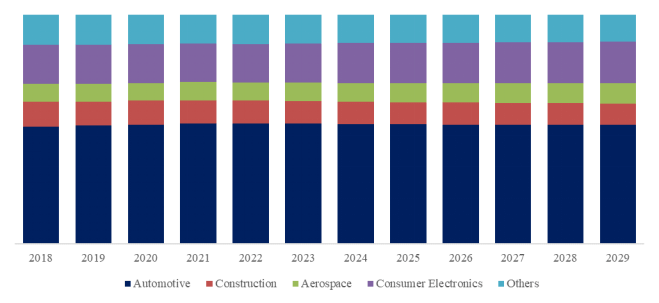 製品の用途別では、自動車が最大の用途であり、52.65%のシェアを占めている。