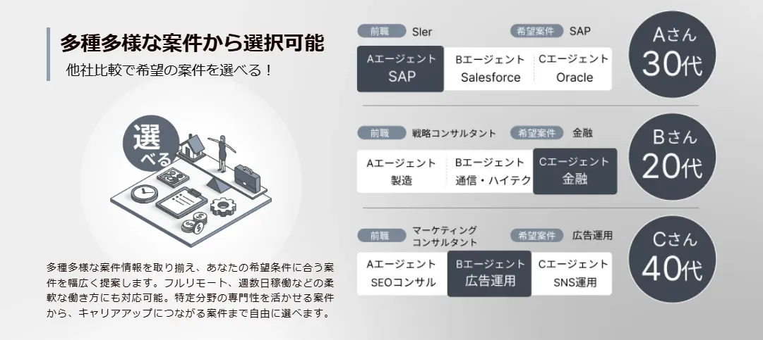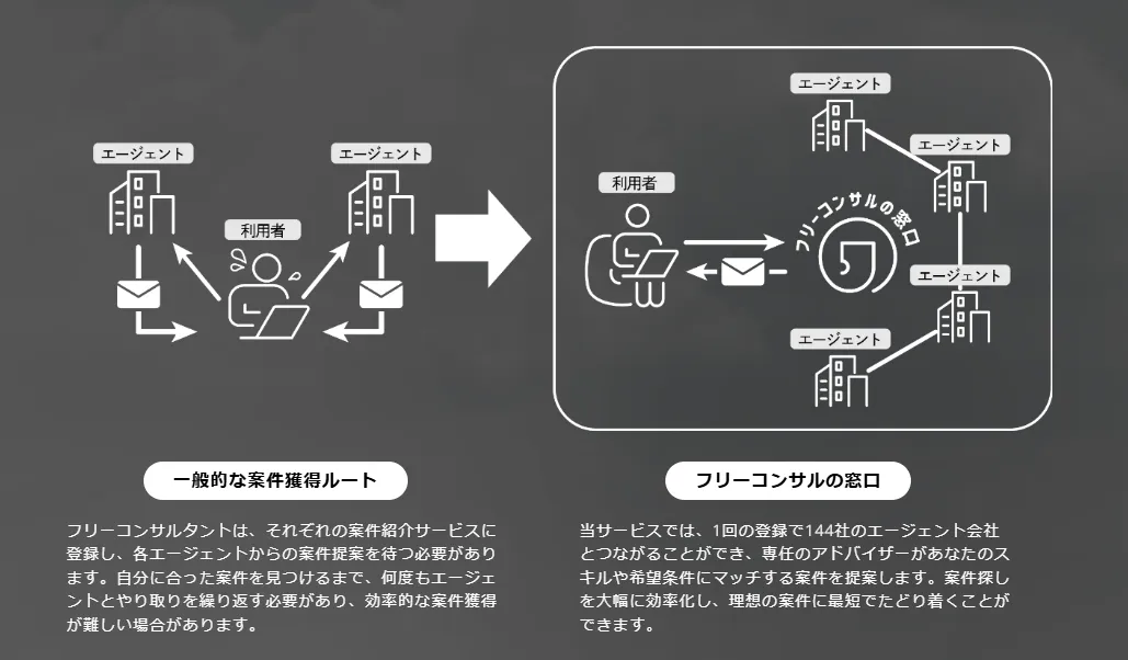 従来、多くのフリーコンサルタントは複数のエージェントに個別登録し、それぞれの案件情報を確認するだけでなく、エージェントとのやり取りにも多くの時間を費やす必要がありました。