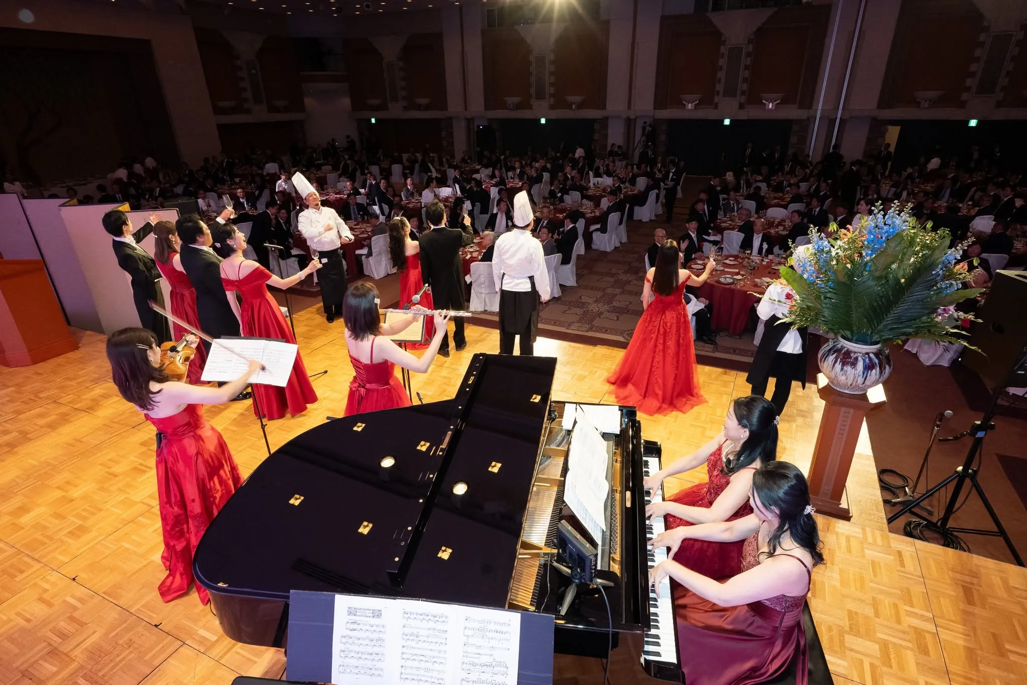 WELCOME MUSICとして上品なクラシック生演奏(ピアノ ヴァイオリン フルートなど)と共に開場し、生演奏で会場の優雅さを演出