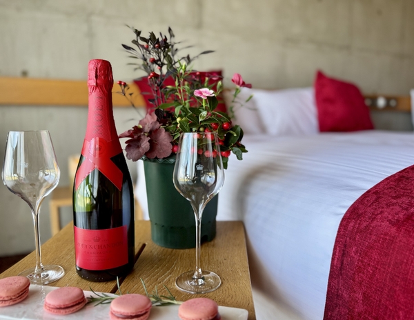 期間中は、ホテル別館「NEST(ネスト)」のセミスイートルームで、冬限定ボトル「モエ・エ・シャンドン モエ アンペリアル SHARE THE LOVE」を楽しめる宿泊プランをご用意。深紅をアクセントにした特別仕様の客室には、シャンパンボトル1本とマカロンをセットでお届けします。