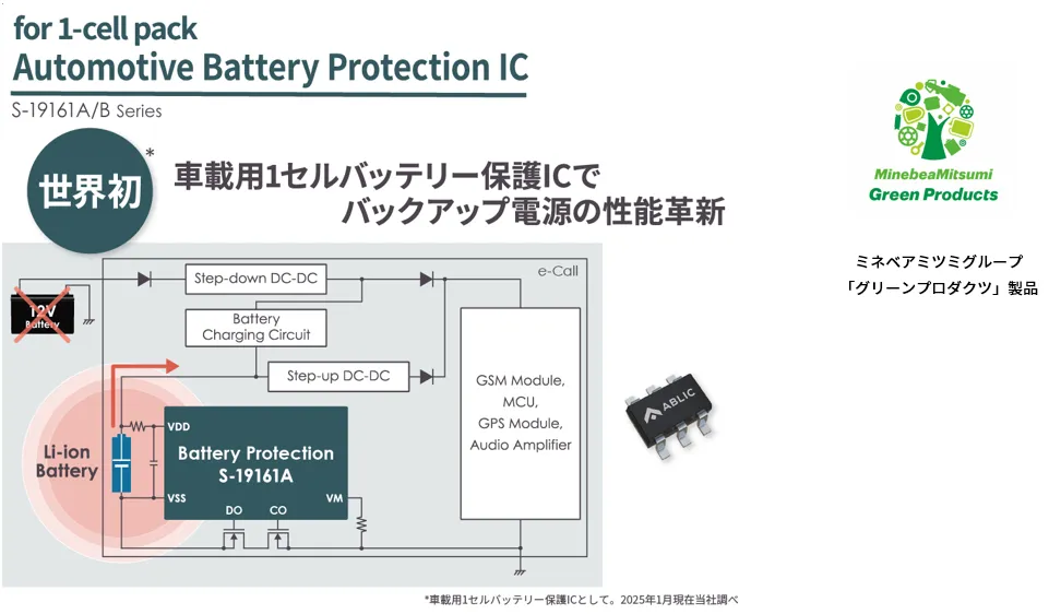 ミネベアミツミグループのエイブリック株式会社(社長:田中 誠司、本社:東京都港区、以下:「ABLIC」)は本日より、世界初(※1)の車載用1セルバッテリー保護IC「S-19161A/Bシリーズ」の販売を開始しました。