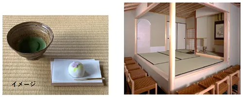 また、館内には一三が自ら考案した椅子席で楽しめる茶室「即庵(そくあん)」を再現した「即心庵」を併設し、定期的に呈茶を実施しています。テーマにあわせたオリジナルのお菓子と一服のお茶で、ゆっくりとした時間をお過ごしください。