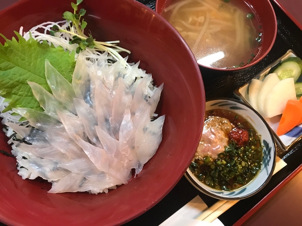 能登直送のかわはぎの刺身を一人前丸ごとごはんに乗せた「かわはぎ肝あえ丼」は、お店の大人気メニューです。