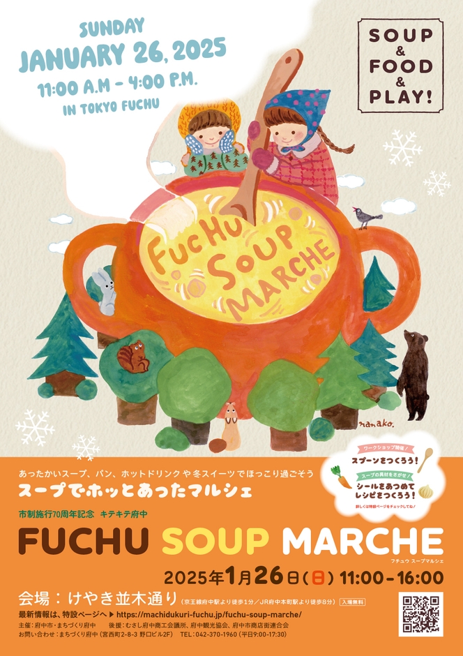 府中市とまちづくり府中(所在地:東京都府中市、代表取締役社長:槇ヶ垰俊一)は、2025年1月26日(日)に府中駅前けやき並木通りにて「FUCHU SOUP MARCHE(フチュウ スープマルシェ)」を開催します。