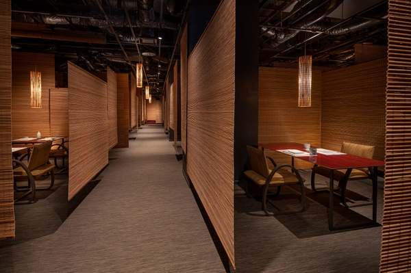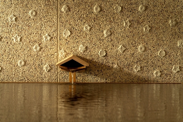 内観には竹、別府石、臼杵(うすき)焼、豊後絞りなど、随所にご当地の素材が使われています。食事処は黒い塗装の空間のなかに、軽やかな竹のすだれが様々な高さ、幅でランダムに浮かび、半個室空間を形成。大浴場の壁面には、ご当地の磁器「臼杵焼き」が400個はめ込まれていて、間接照明の柔らかい光によってキラリと輝きます。ご当地の素材が意外性ある形で取り入れられており、デザインの中で発見するのも楽しみのひとつです。