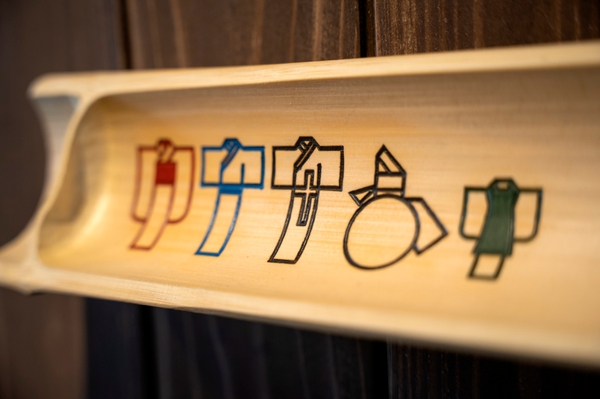 館内は伝統的な温泉地の路地を歩いているような懐かしさを感じつつも、わくわくするような遊び心のあるデザインに満ちています。ロビーには温泉の象徴である湯桶を積んだような手湯や、別府の魚商人の屋台からインスピレーションを得た台車、「BEPPU(別府)」のBをかたどった特徴的な脚をもつスツールなど、様々な仕掛けがをいっぱいです。館内の各所に掲げられたサインにはオリジナルのピクトグラムが採用されています。