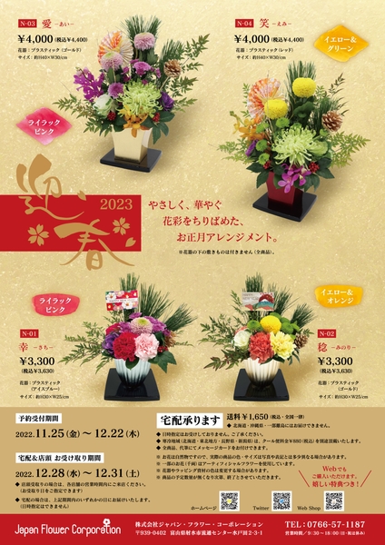 北陸三県(富山、石川、福井)でフラワーショップ花まつを展開する株式会社ジャパン・フラワー・コーポレーション(本社:富山県射水市、代表取締役社長:松村吉章、以下「JFC」)は、お正月を華やかに彩るお花を揃えたJFCオリジナル「迎春カタログ2023」をご用意いたしました。