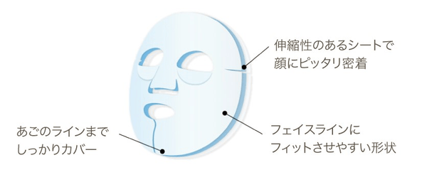 薬用保湿成分「ヘパリン類似物質」と、薬用美白※3成分「プラセンタエキス」の2つの薬用成分に加え、輪郭を引き上げながら密着できる伸縮形状の3層構造シートを採用。たっぷりの保湿美容液を角層すみずみまで浸透させ、肌全体にうるおいを届けます。