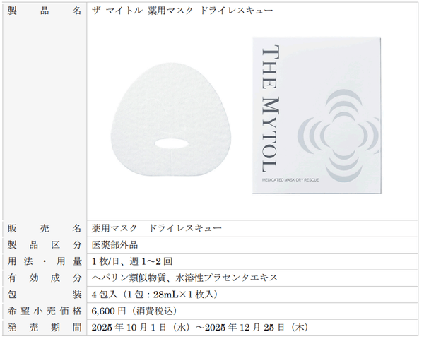 大正製薬株式会社[本社:東京都豊島区 社長:上原 茂](以下、当社)は、先端皮膚科学研究に基づくエイジングケア※1ブランド「THE MYTOL(ザ マイトル)」より期間限定発売していた、日本初※2となる2つの薬用成分、「ヘパリン類似物質」と「プラセンタエキス」配合の薬用シートマスク「ザ マイトル 薬用マスク ドライレスキュー」(以下、本製品)を、ご好評につき、再度期間限定発売(2025年10月1日~2025年12月25日)いたします。