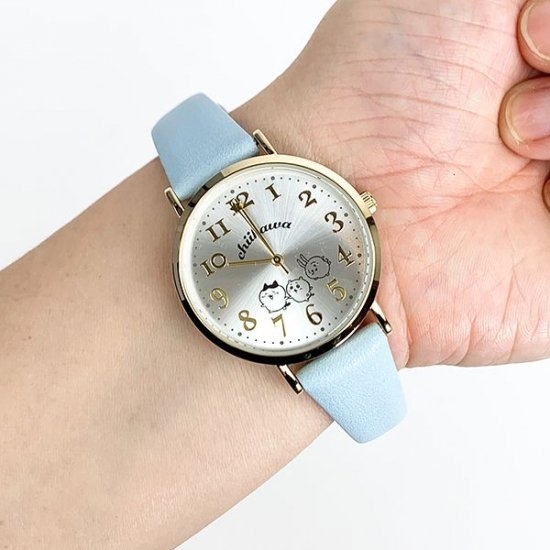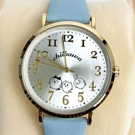 ブルーのベルトが綺麗な、ちいかわデザインの腕時計。文字盤にはちいかわやハチワレの仲良さげなイラストがデザインされています♡
