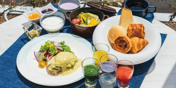 地元で採れた野菜を使用した蒸野菜や色鮮やかな五色のオリジナルドリンク、そして朝食には欠かせない存在ともいえるニューヨーク発祥のエッグベネディクトをアレンジした自家製鯛ベーコン入りの「UNOベネディクト」など、ヘルシーなだけでなく、写真映えも良い朝食です。