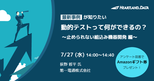 ハートランド・データ株式会社(本社:栃木県足利市)は、2022年7月27日(水)に、無料ウェビナー「【最新事例が知りたい】動的テストって何ができるの?~止められない組込み機器開発 編~」を開催いたします。本セミナーでは、ナットランナーのパイオニアである第一電通株式会社の荻野様を講師にお迎えし、動的テストの活用事例をご紹介いたします。