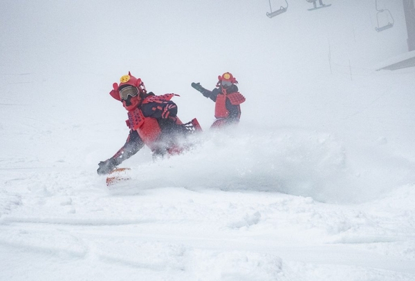 国内有数の規模を誇るスキー場「星野リゾート アルツ磐梯」は、2020年12月25日に2020-21シーズンの営業を開始しました。当日は、オープニングイベントとして「2020-21シーズン出陣式」を実施しました。出陣式では、会津らしさを表現できるように、サムライに扮したスタッフが登場。スノーモービルに乗りながら的を打ち抜く「スノーモービルやぶさめ」を披露し、シーズン中の降雪とコロナウイルス退散を祈願しました。その後、ゲストとともに刀を使って、しめ縄のテープカットを行い、一斉に滑り降りました。