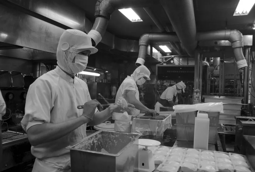 店内からガラス越しに豆腐づくりの作業をご覧いただけます。