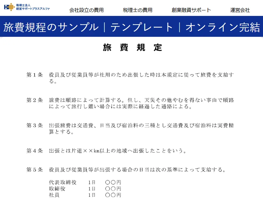 「旅費規程のサンプル|テンプレート|オンライン完結」ツール: https://keiei-support-plus-a.com/zeirishi-hiyou/ryohikitei-sample-template/