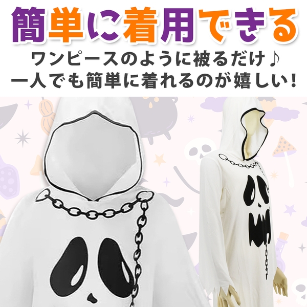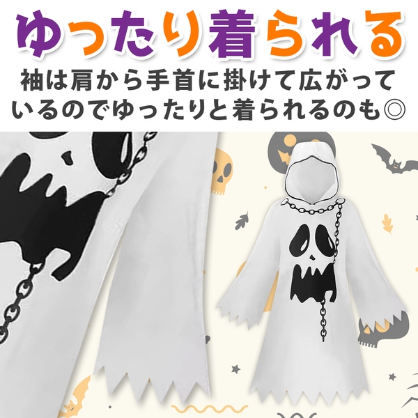 ハロウィンの主役になること間違いなしのおばけコスプレは、頭から被るだけで仮装が完成!ワンピース型のデザインのため、バタバタと忙しいお出かけ前でもスムーズに準備ができます。袖部分はフレアスリーブのように広がった仕様により、ゆったり感がおばけらしいシルエットを演出。デザイン性だけでなく動きやすさも兼ね備えているため、パーティーやイベントで元気いっぱいにお過ごしいただけます。