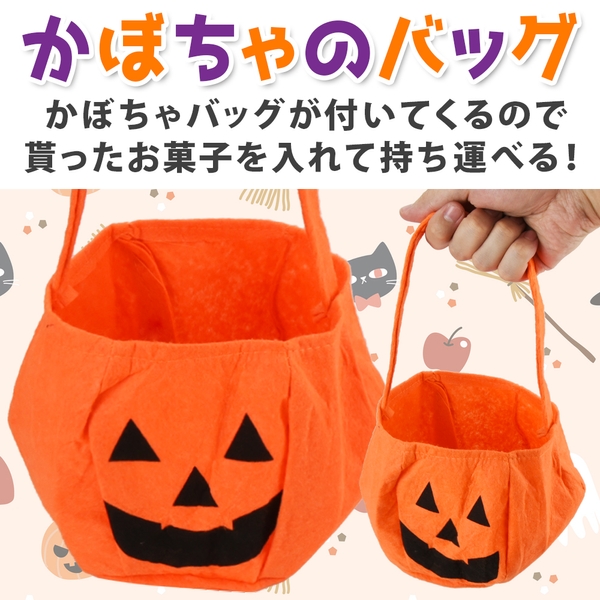 シンプルな無地デザインではなく、中央に怯えているようなおばけの顔がプリントされているため、より一層ハロウィンの雰囲気を盛り上げます。そして、ハロウィンといえば…カボチャをくり抜いて顔を作る"ジャック・オー・ランタン"が有名です!コスチュームと併せて使えるジャック・オー・ランタン型の手提げバッグも付属します。「トリック・オア・トリート」と唱えてお菓子をたくさんGETしましょう!