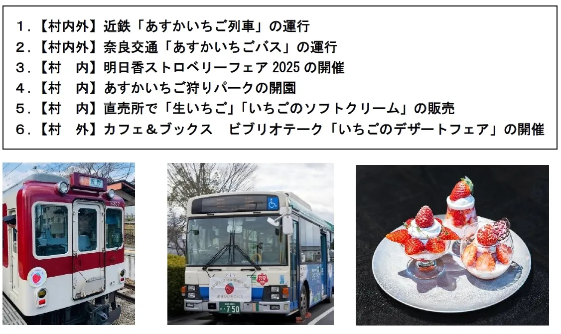 村内の農商工業者によるいちご狩りやスイーツめぐりの実施に合わせて、近畿日本鉄道株式会社(本社:大阪府大阪市、代表取締役社長:原恭、以下近鉄)、奈良交通株式会社(本社:奈良県奈良市、取締役社長:田中耕造、以下奈良交通)と協力し、期間限定でキャンペーン列車、バスも運行します。