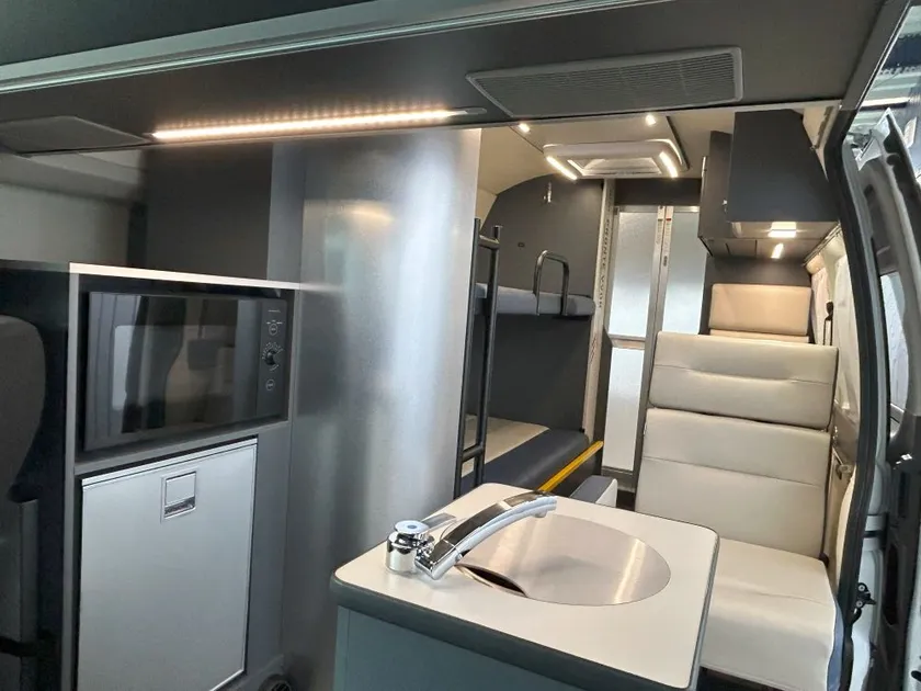 本モデルは、「都道府県知事からの要請で市民ボランティアが被災地に向かうことを想定したキャンピングカー」で、2~3名のボランティアが被災地の方々の支援を受けることなく、自己完結で活動を行うことを目的としています。電装系に新24V電装システムを採用、当社オリジナル大容量バッテリー(7.2kWh)を搭載し2泊3日の活動に充分な能力を有しています。また水の浄化装置とマイクロバブル発生装置を搭載し、当社独自の防水シャワールームと併せてクリンネスも保つことができます。