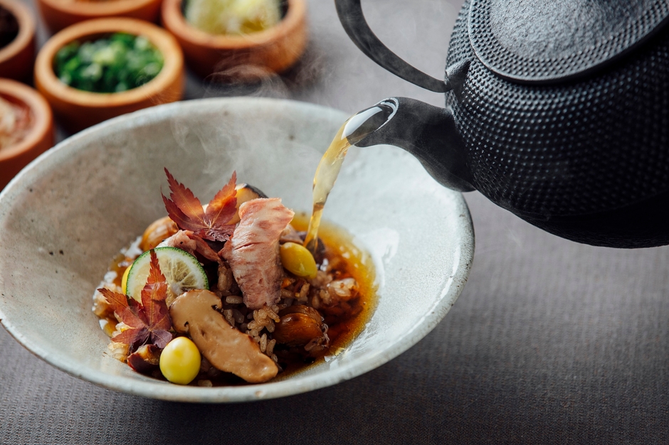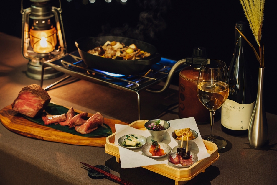 ディナーは、秋の味覚をふんだんに使ったコース料理です。十五夜の月に米や芋などの秋の収穫物を供え、五穀豊穣に感謝するという風習から着想を得て考案しました。メインは、ダッチオーブンで炊き上げる具沢山の炊き込みご飯です。まずは、松茸や栗、銀杏など秋に旬を迎える食材を使った炊き込みご飯をローストビーフと共に味わったあと、バーナーで温めた熱々の出汁をかけて、出汁茶漬けにします。グランピングマスターがサポートをするため、アウトドア器具の扱いに慣れていない方でも気軽に料理を仕上げる工程を楽しめます。