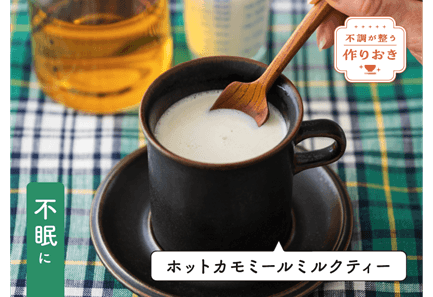 寝つきの悪さが気になるときは、就寝の1時間前くらいにノンカフェインのホットカモミールミルクティーを飲むことを習慣化すると安眠しやすくなります。