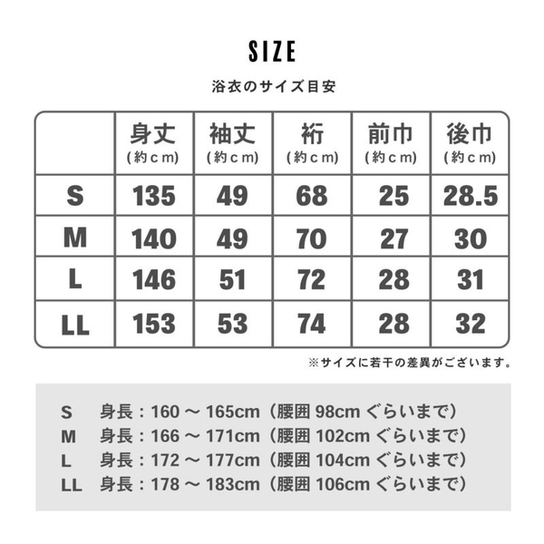 男性浴衣の場合、着付け方はガウンのように体に羽織って前で合わせるだけ。とても簡単ですが、丈が長すぎる浴衣や小さすぎる浴衣を着付けで調整する方法がありません。そのため、できる限りご自身の体型に合わせたサイズ選びが重要になります。