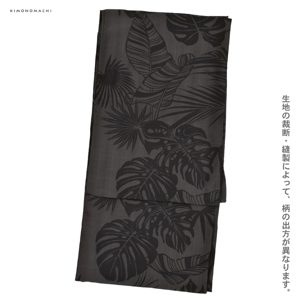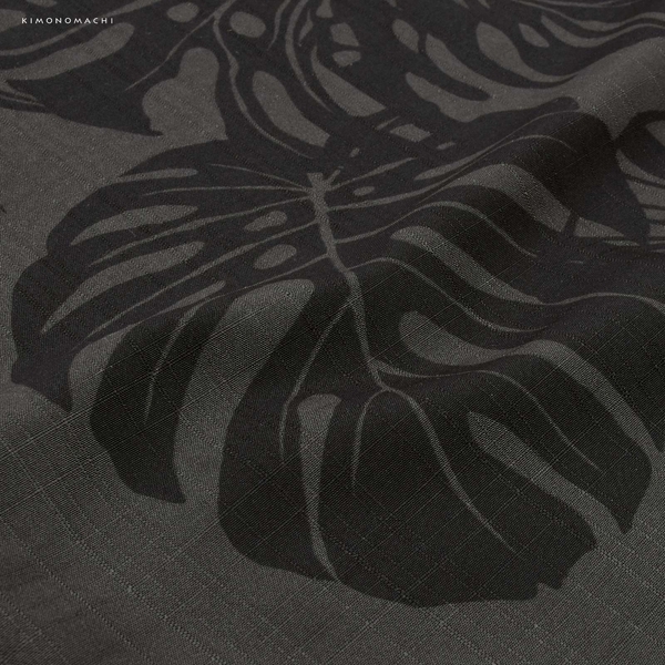 チャコールグレーの地に、黒で全体に表現された椰子(ヤシ)や棕櫚(シュロ)、オーガスタ、モンステラなど南国植物の葉。